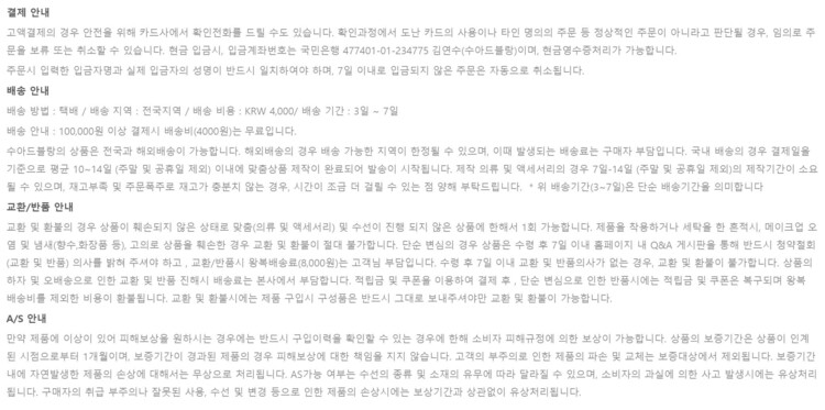 결제, 배송, 교환/반품, AS 안내에 대한 자세한 사항은 하단 내용을 참고해 주시길 바라며, 신중한 구매 부탁드립니다.
